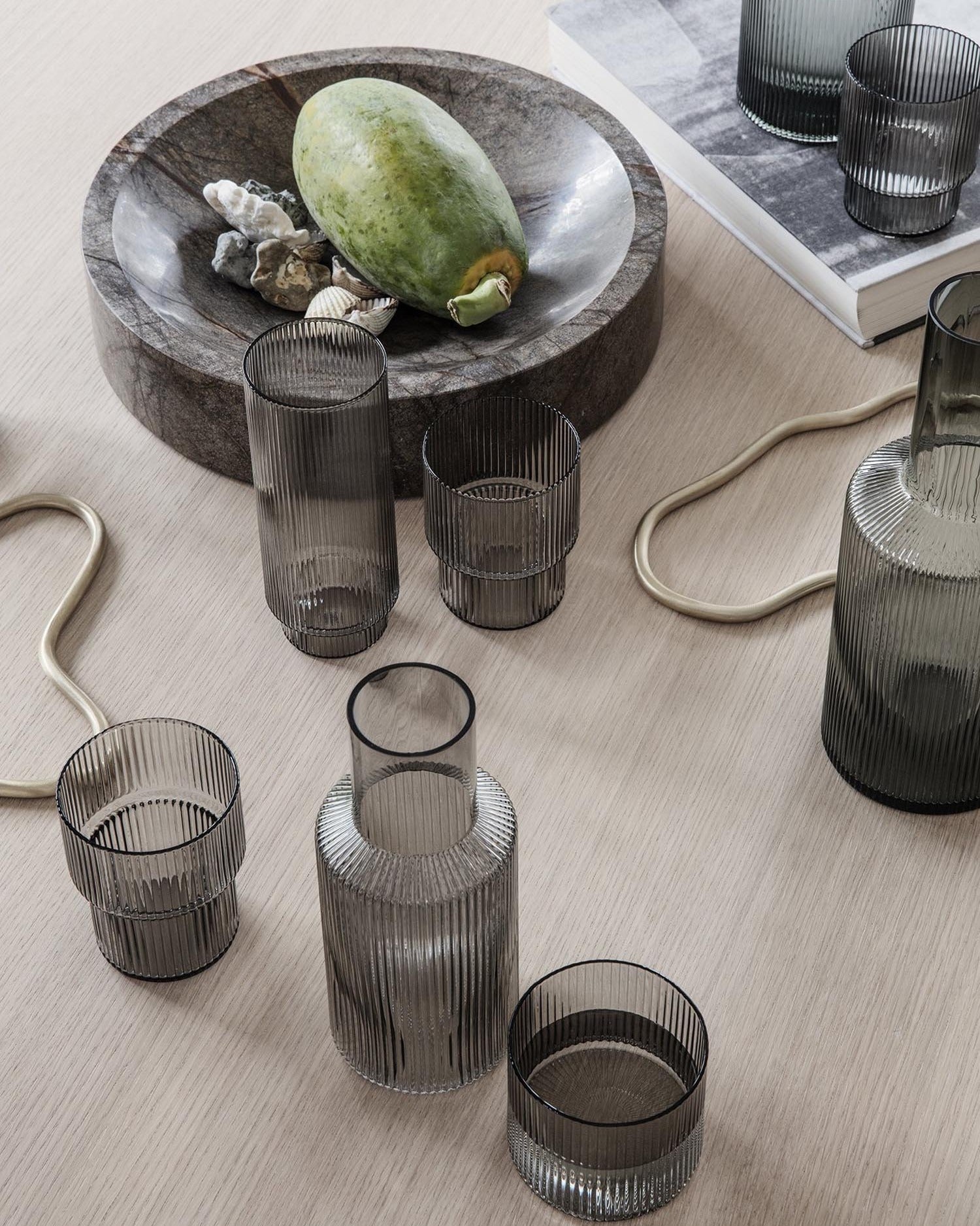 Elegante, mundgeblasene Ripple Gläser im 4er Set, ideal für stilvolle Tischdekoration. Entdecken Sie das 4er Set der einzigartigen Ripple Gläser von Ferm Living – handgefertigte, stilvolle Gläser für jeden Anlass.
