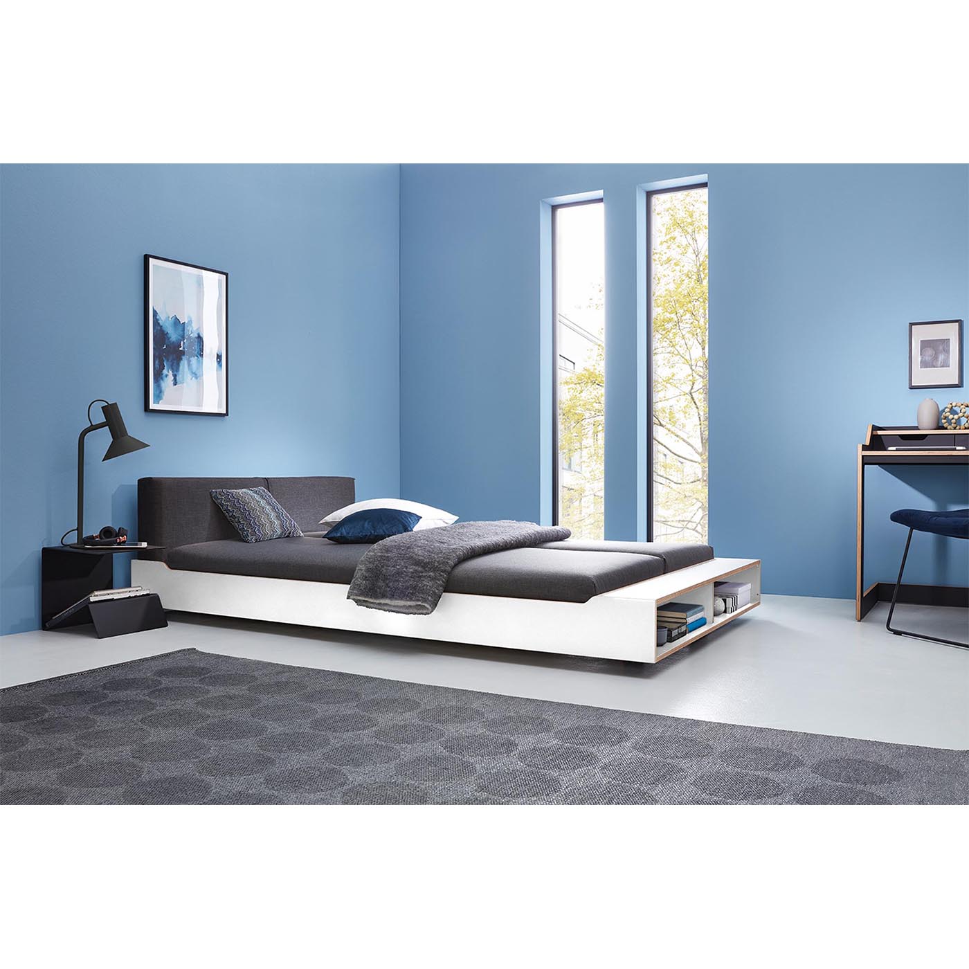 The surface of the seat backs can be freely selected according to our Müller fabric selection. The two boxes can also be used as filing for books or other things. Complement your bedroom with matching bedside tables or chests of drawers from our range.