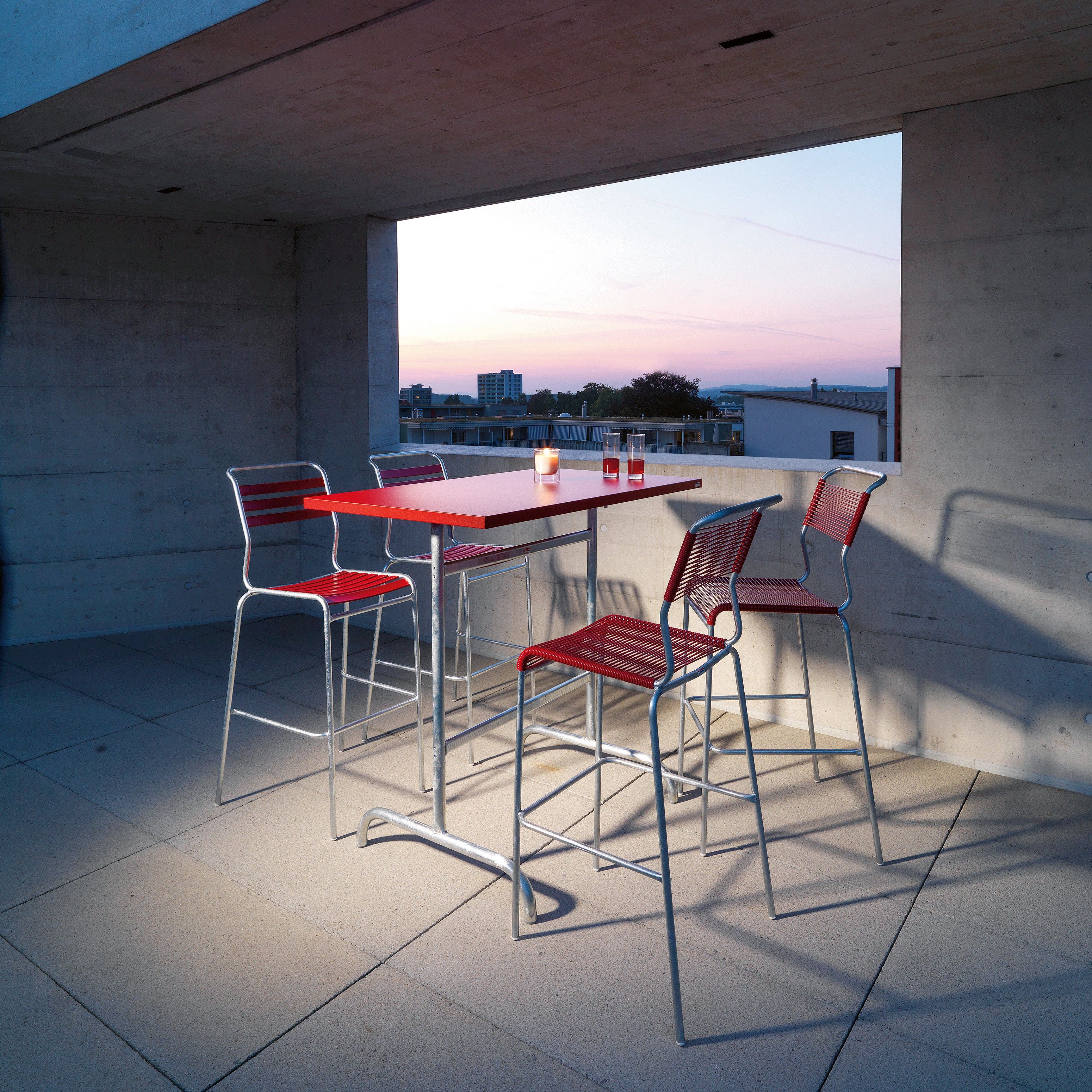 The chairs are also weatherproof and stackable. Available with or without armrests, with slats or as «Spaghetti» version, as bank or «Lounger» or in the high «Bar» version. Check out our Chair collection to.
