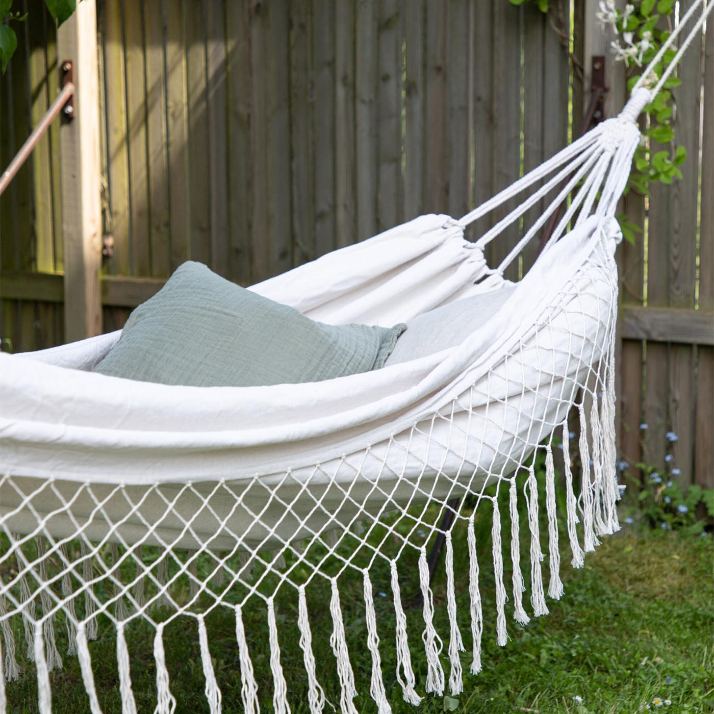 Fabriqué à partir de 100 % coton respirant de haute qualitéCe hamac procure une sensation agréable sur la peau et une circulation d'air optimale, même lors des chaudes journées d'été. Ses matériaux résistants sont non seulement doux et confortables, mais aussi durables et faciles d'entretien, pour que vous puissiez en profiter longtemps. Vous trouverez des kits de suspension et des supports de hamac pratiques dans notre section accessoires.