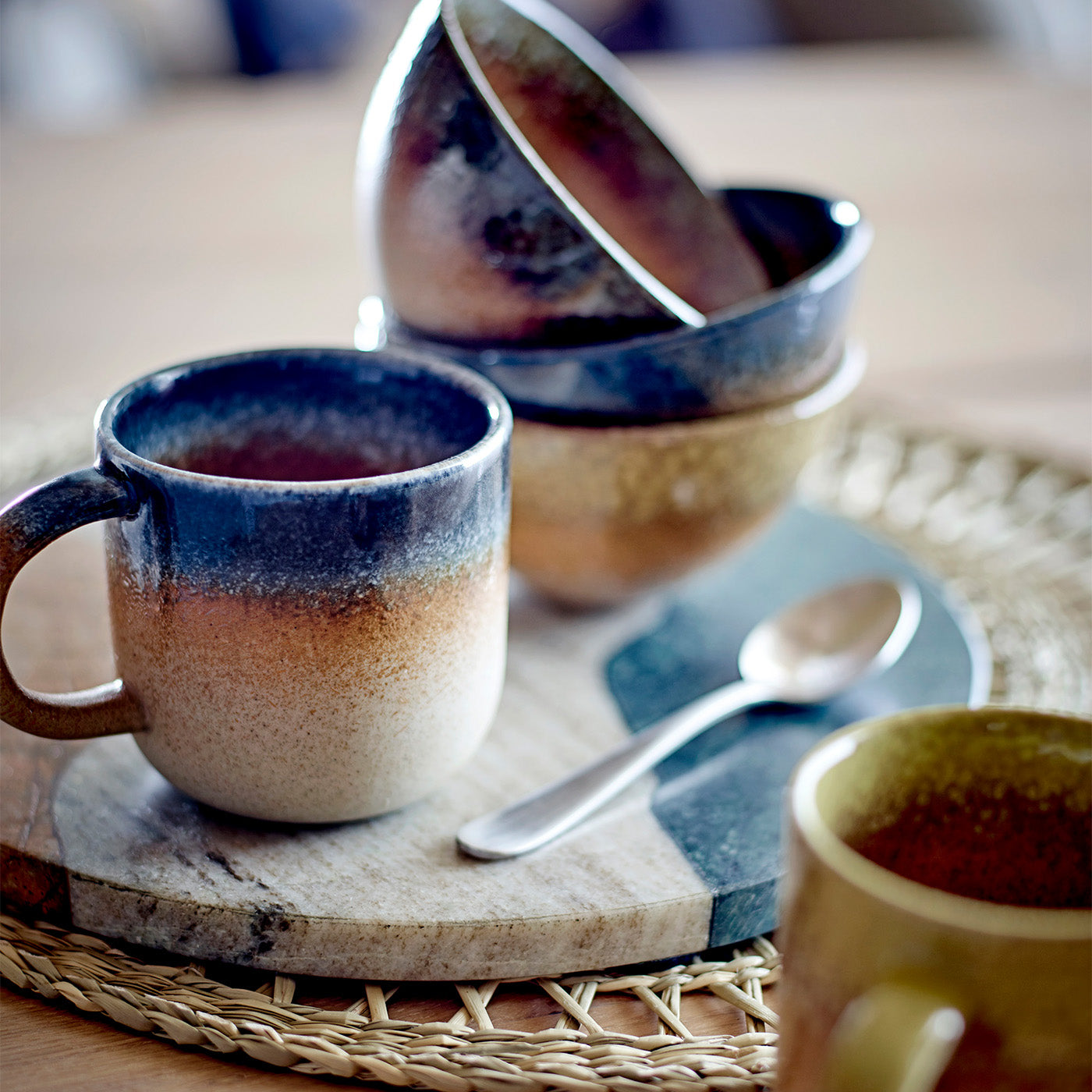 I colori tenui in Blu E Braun conferisce alla tazza un'aura calmante, perfetta per Filosofia del design nordico Questa armoniosa combinazione di colori crea un'atmosfera accogliente che è Colazione così come durante l'accogliente festa del caffè al meglio. Scopri anche il nostro Prodotti di design nordicoper rendere elegante la tua casa.