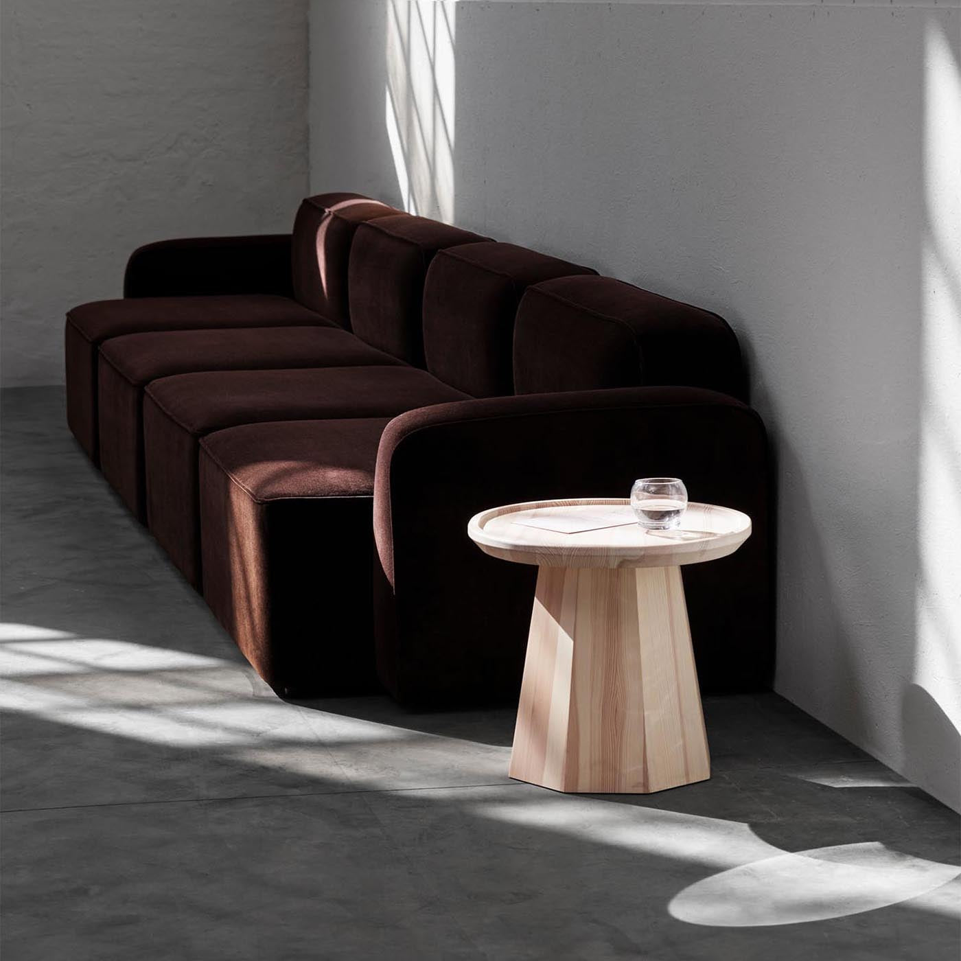 Il tavolo Pine Table Small Pine è caratterizzato dalla sua voluminosa base ottagonale, che gli conferisce un aspetto distintivo. Il piano, invece, è stretto e arrotondato, conferendo alla struttura una leggerezza visiva. Questa combinazione di base solida e piano delicato rende il tavolo un elemento di spicco in qualsiasi ambiente.