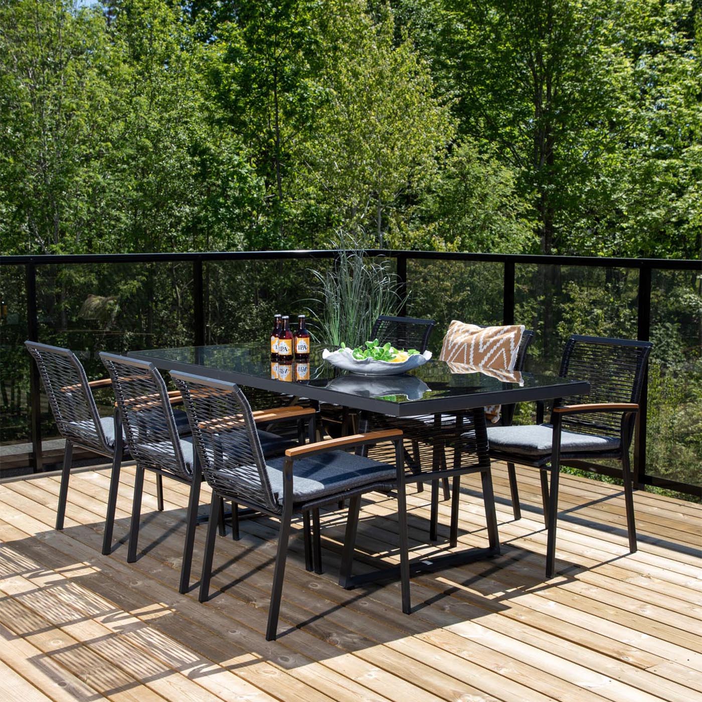 Die Tischplatte aus gehärtetem Glas bietet eine glatte, pflegeleichte Oberfläche, die sowohl modern als auch zeitlos wirkt. Der Aluminiumrahmen ist leicht, aber dennoch extrem stabil, was das Set ideal für den täglichen Gebrauch macht. Die Wicker-Elemente verleihen dem Set eine natürliche Note und sorgen für ein angenehmes Ambiente. Schauen Sie sich auch unsere Esszimmermöbel an, um Ihr Zuhause stilvoll einzurichten.