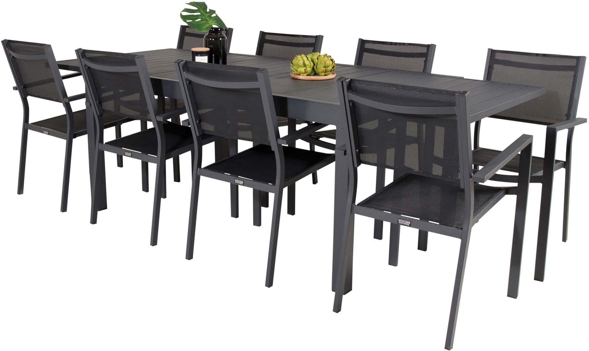 Marbella Tisch 160/240 – Schwarz/Schwarz – Copacabana Stapelstuhl – Schwarz/Schwarz 8 / Ausziehbar: L: 160 cm / 240 cm