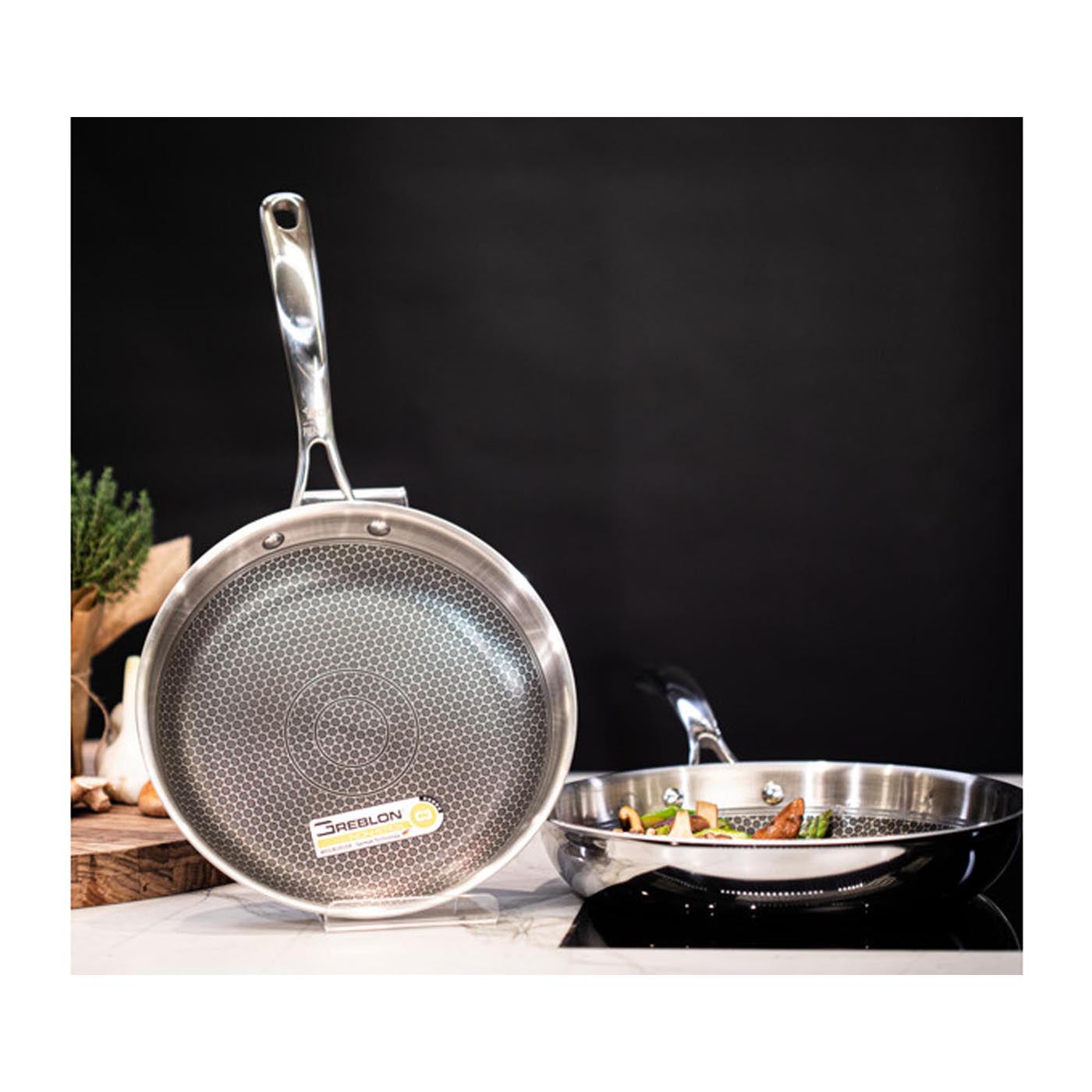 aus Edelstahl, innen Edelstahl 18/8 -18/10, durchgehender Aluminium-Kern, aussen magnetischer Edelstahl, Gesamtmaterialstärke ca. 2.5 mm, aussen hochglanzpoliert, innen hochglanzpoliert mit Wabenboden: Ätzung Weilburger C3, die erhabene Edelstahlstruktur schützt die Antihaftversiegelung perfekt und ist kratzfest, scharfe und krosse Zubereitung für hohe Temperaturen, gleichmässige Wärmeverteilung vom Boden bis zum Rand, Öl-Dosiersystem (Oil Optimizer) garantiert einen reduzierten Einsatz von Ölen, für den fettarmen, fettfreien Einsatz, reinigungsfreundlich, backofenfest bis 240°C, für alle Herdarten geeignet, inkl. Induktion