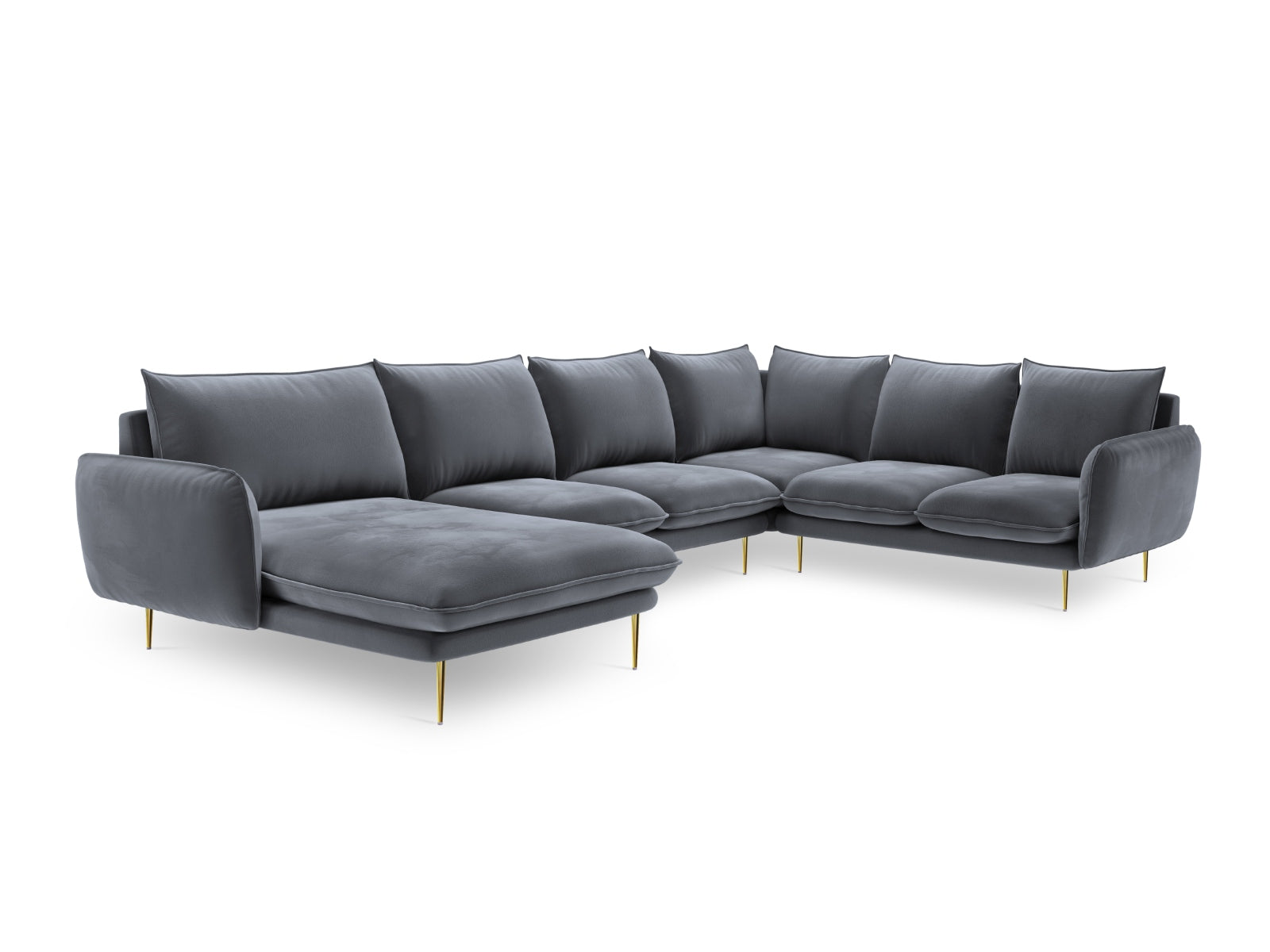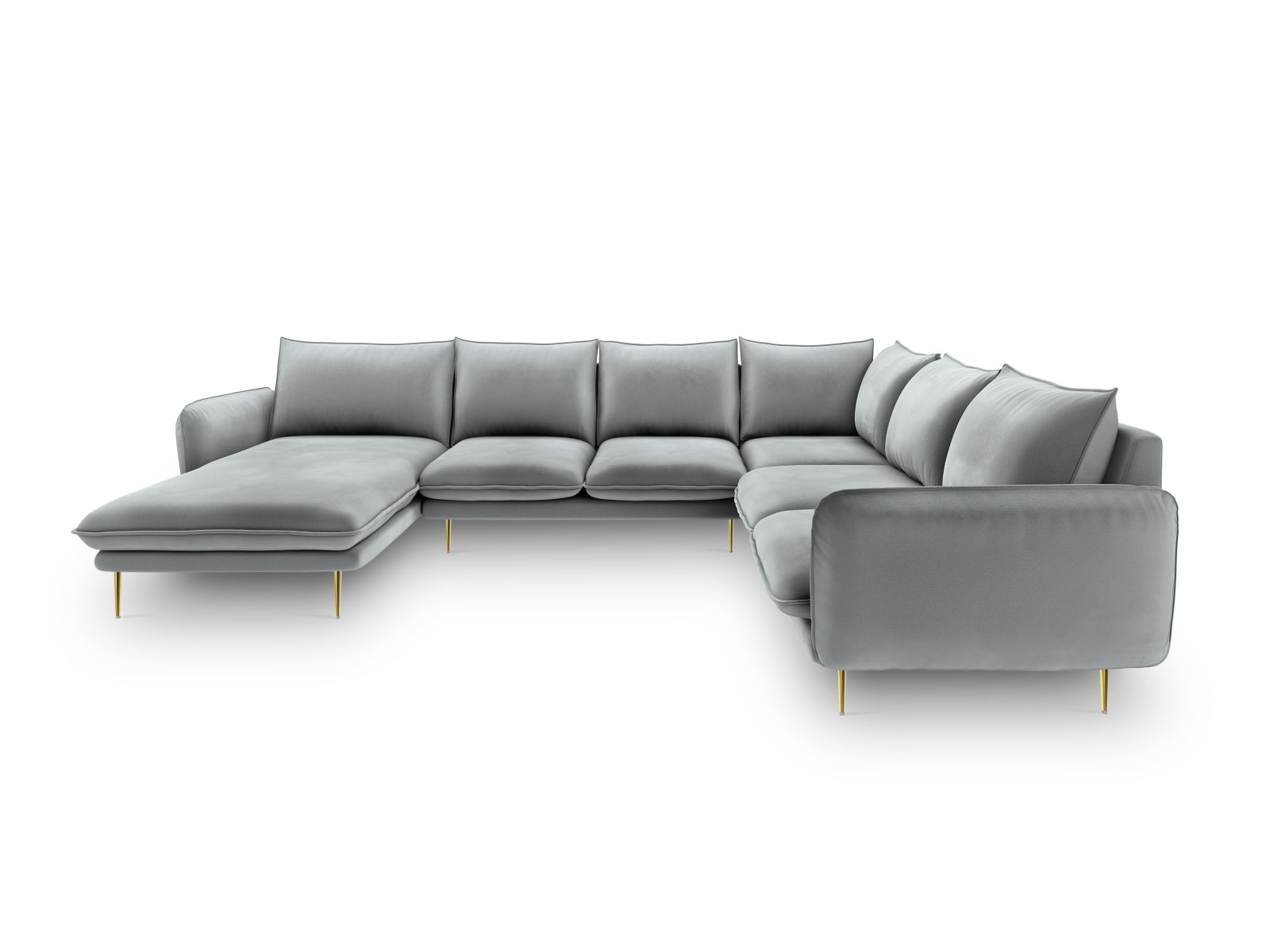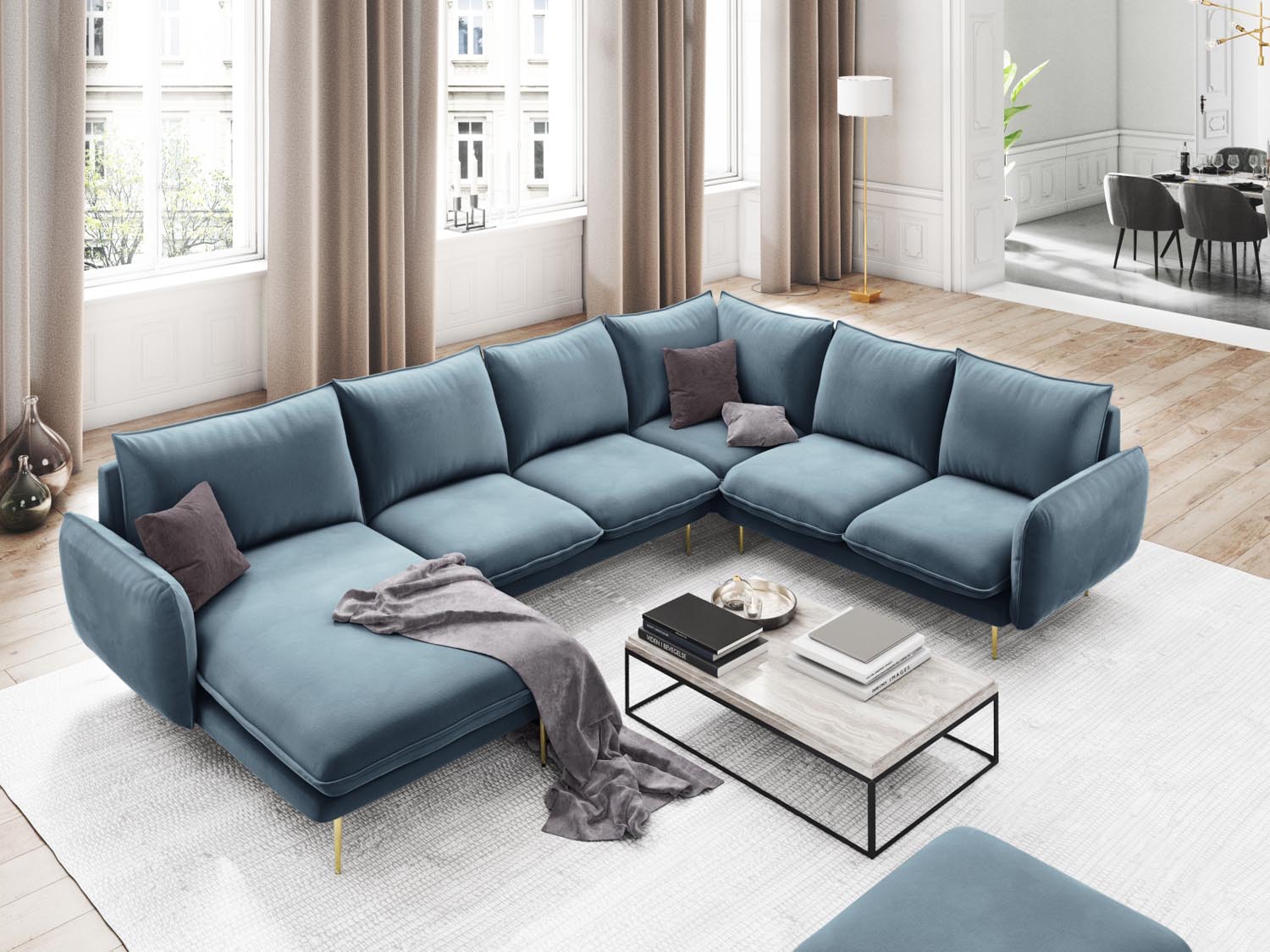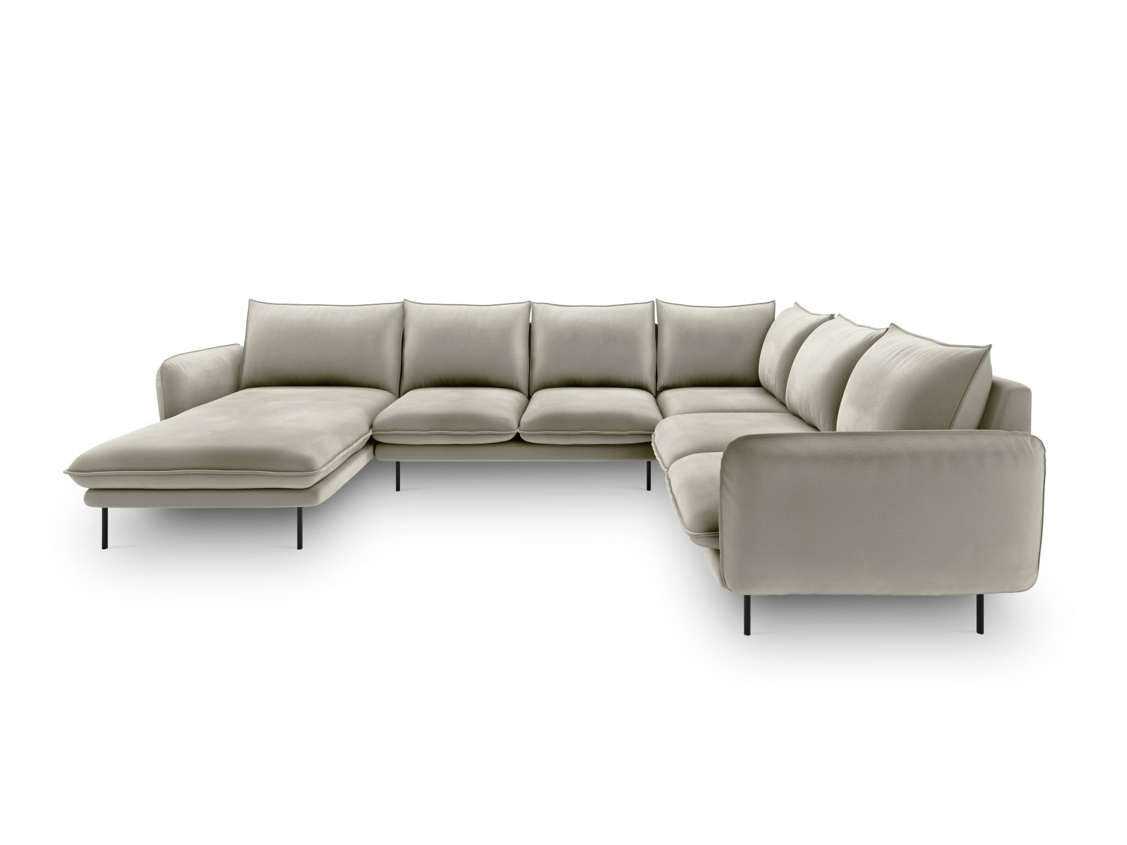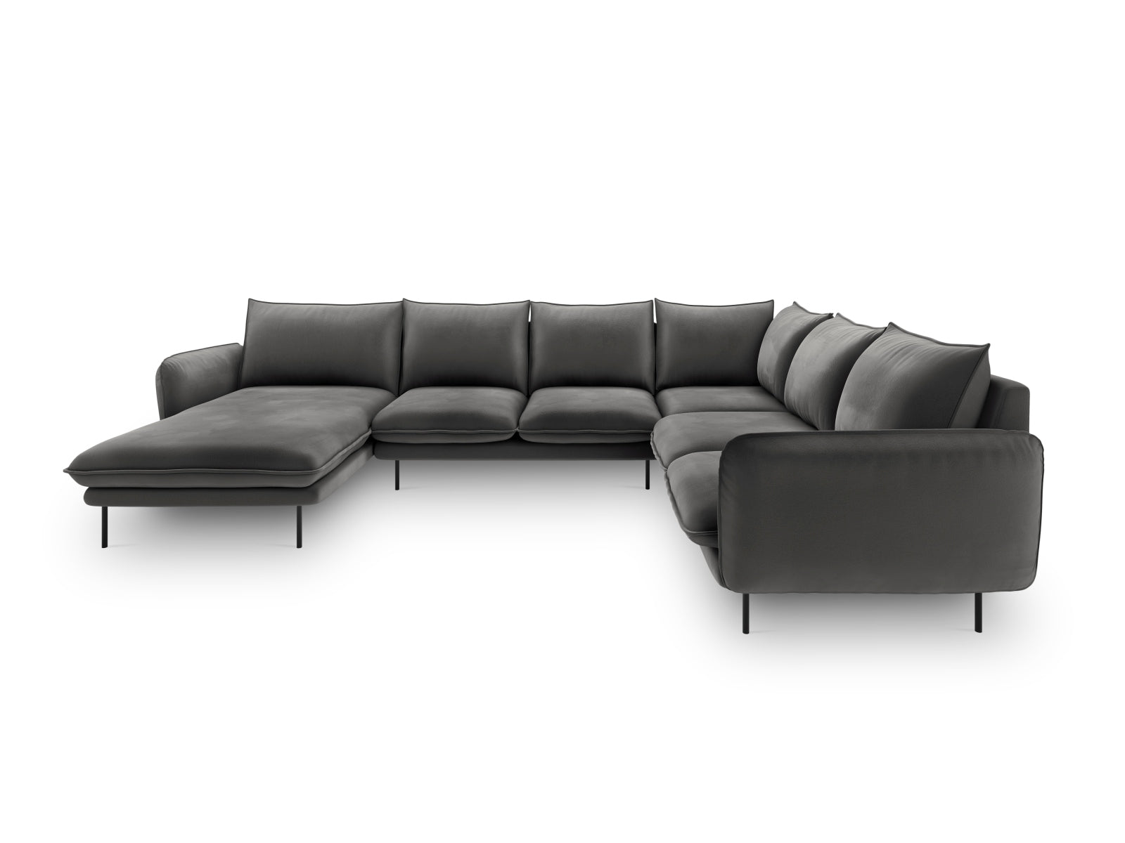 Entdecken Sie das Vienna Velour Panoramic Ecksofa rechts von Cosmopolitan Design, ein stilvolles und komfortables Möbelstück, das perfekt für Ihr Wohnzimmer geeignet ist. Mit einer großzügigen Breite von 235 cm bietet dieses 7-Sitzer Sofa ausreichend Platz für Familie und Freunde. Genießen Sie gesellige Abende und entspannte Stunden in einem modernen Ambiente.