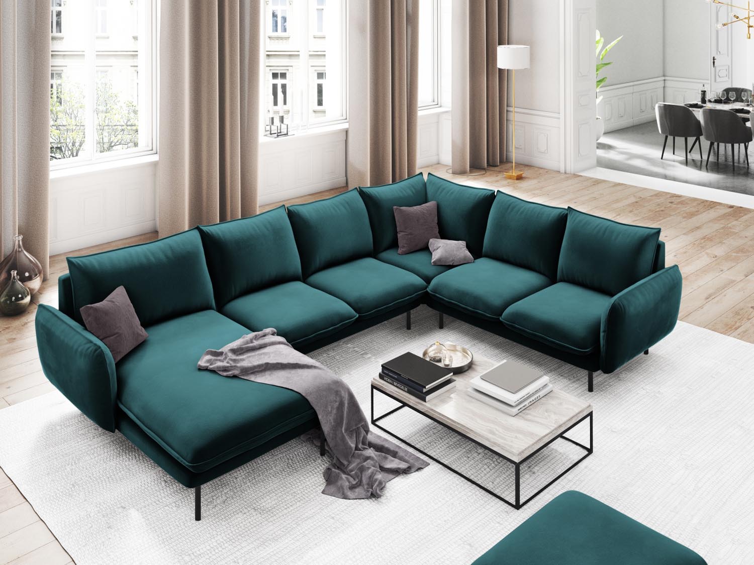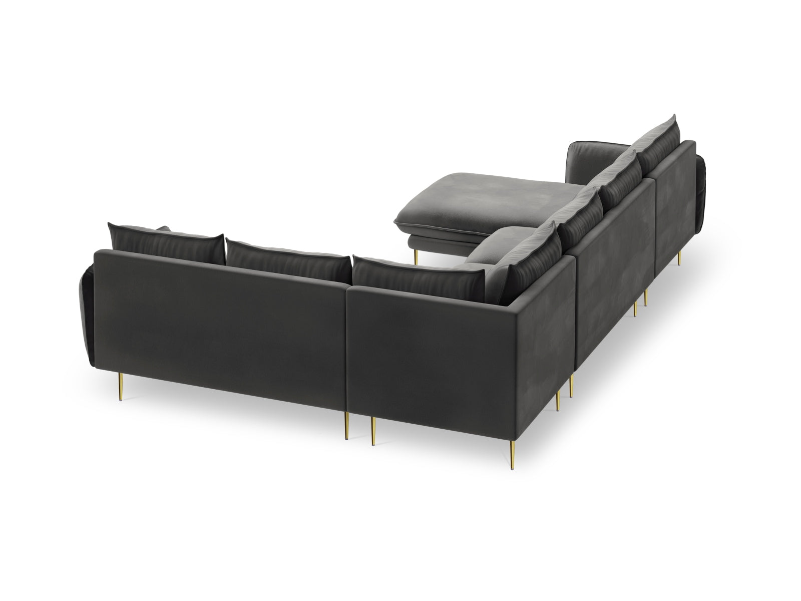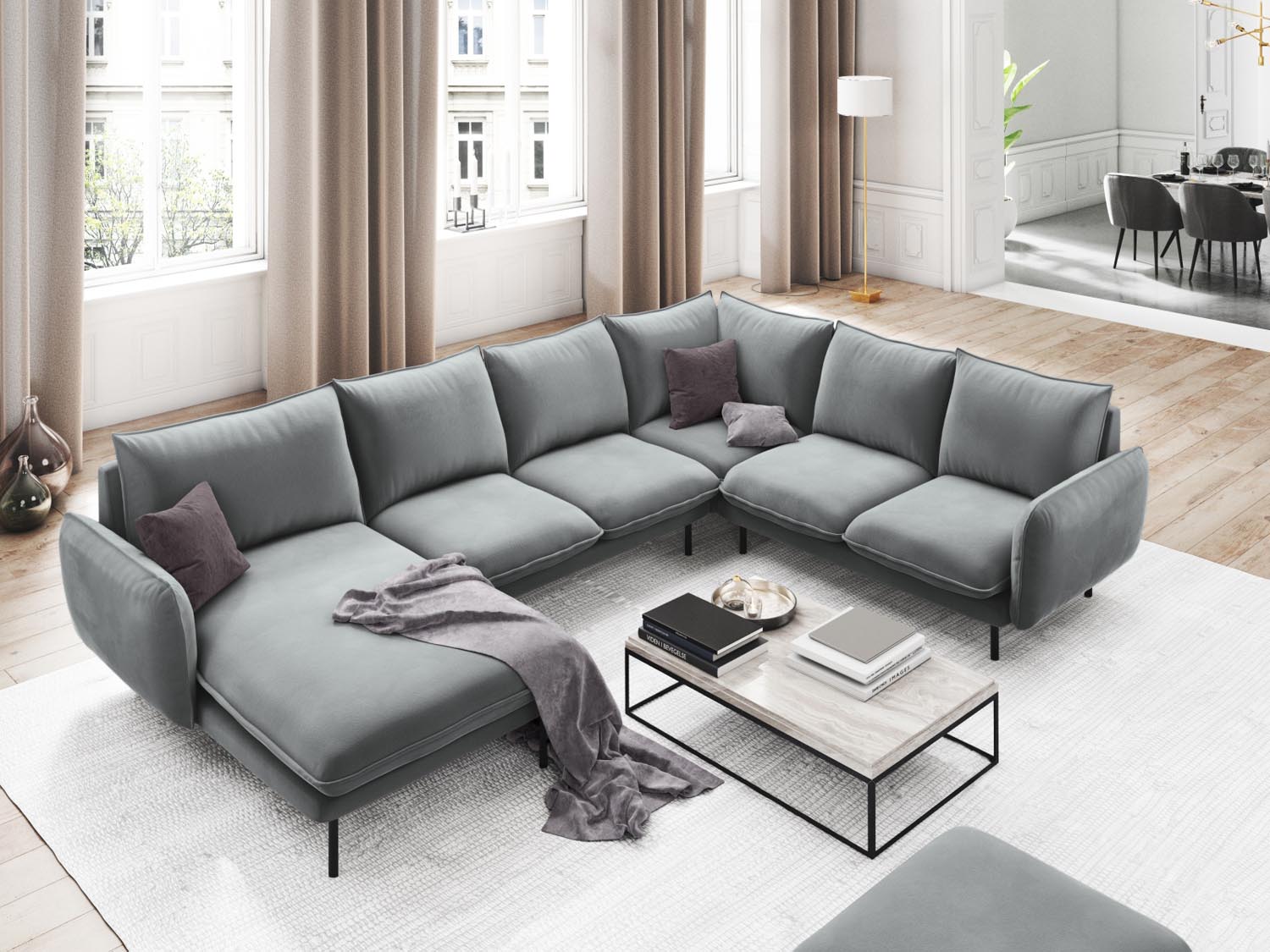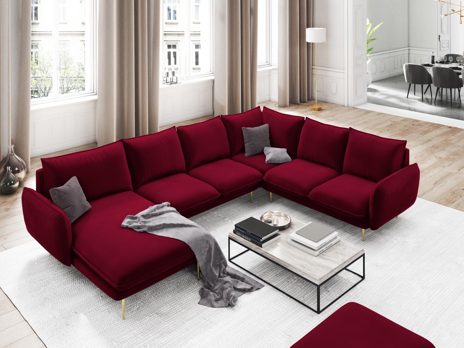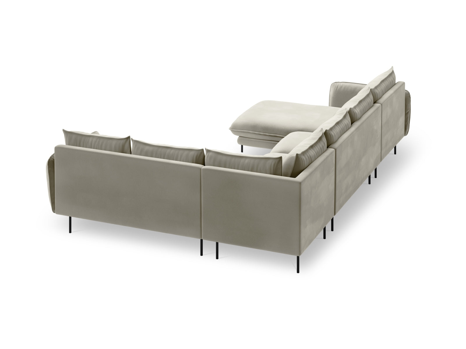 Entdecken Sie das Vienna Velour Panoramic Ecksofa rechts von Cosmopolitan Design, ein stilvolles und komfortables Möbelstück, das perfekt für Ihr Wohnzimmer geeignet ist. Mit einer großzügigen Breite von 235 cm bietet dieses 7-Sitzer Sofa ausreichend Platz für Familie und Freunde. Genießen Sie gesellige Abende und entspannte Stunden in einem modernen Ambiente.
