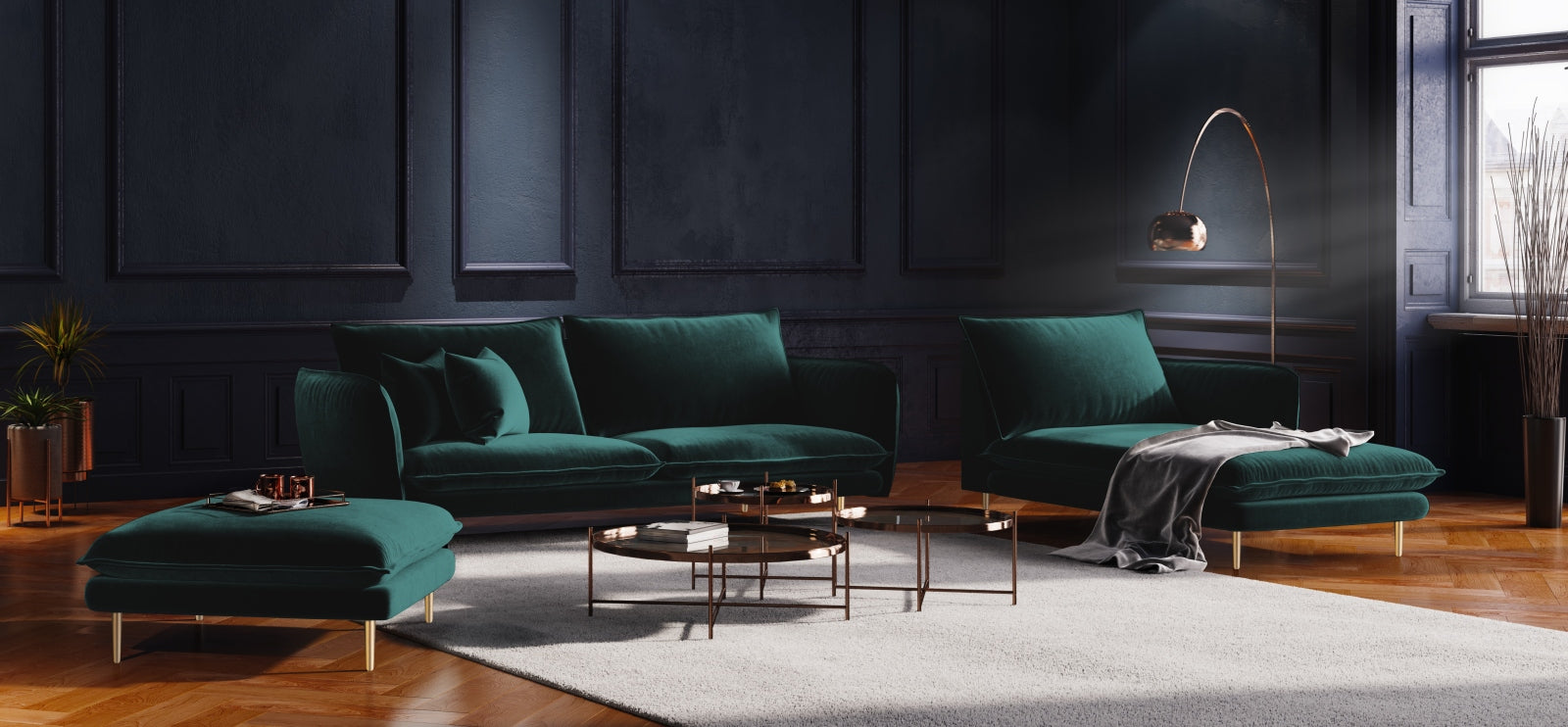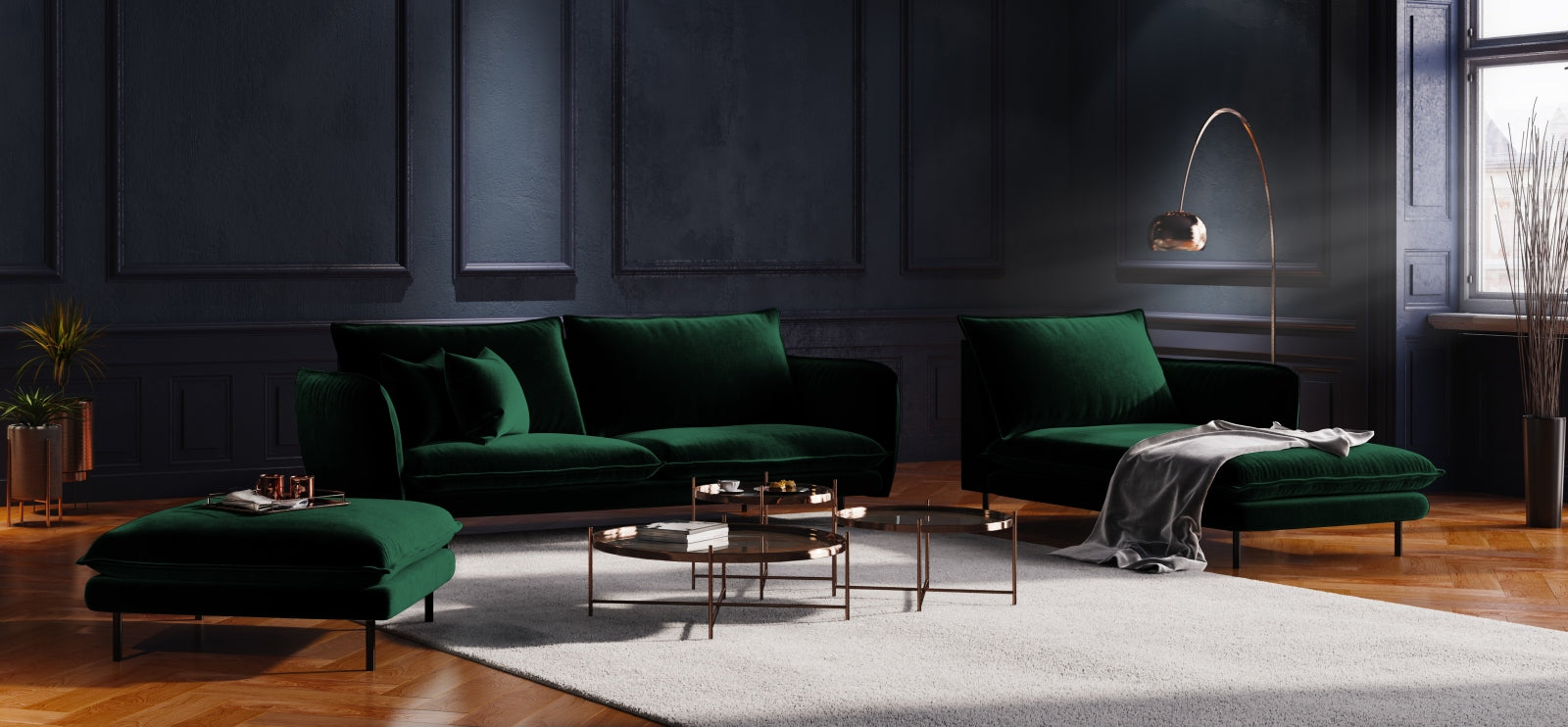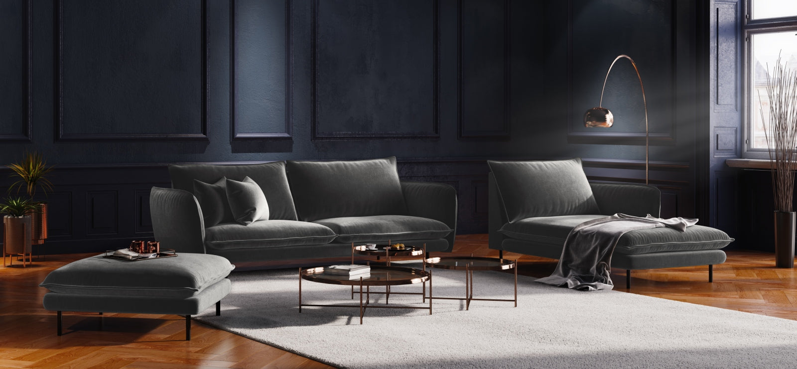 Das Vienna Velour Sofa ist nicht nur ein Blickfang, sondern auch äußerst funktional. Die L-Sofa rechts Konfiguration ermöglicht es Ihnen, das Sofa optimal in Ihre Wohnlandschaft zu integrieren. Ob für gesellige Abende mit Freunden oder entspannte Stunden allein – dieses Sofa passt sich Ihren Bedürfnissen an.